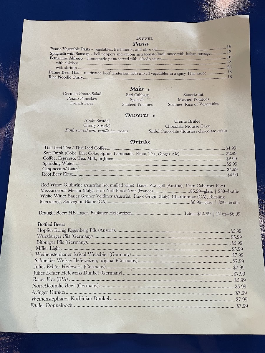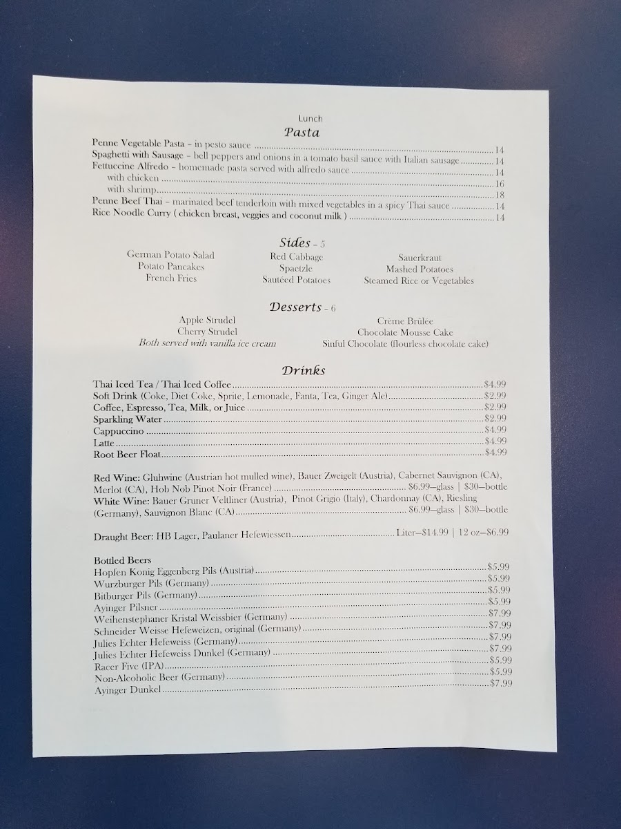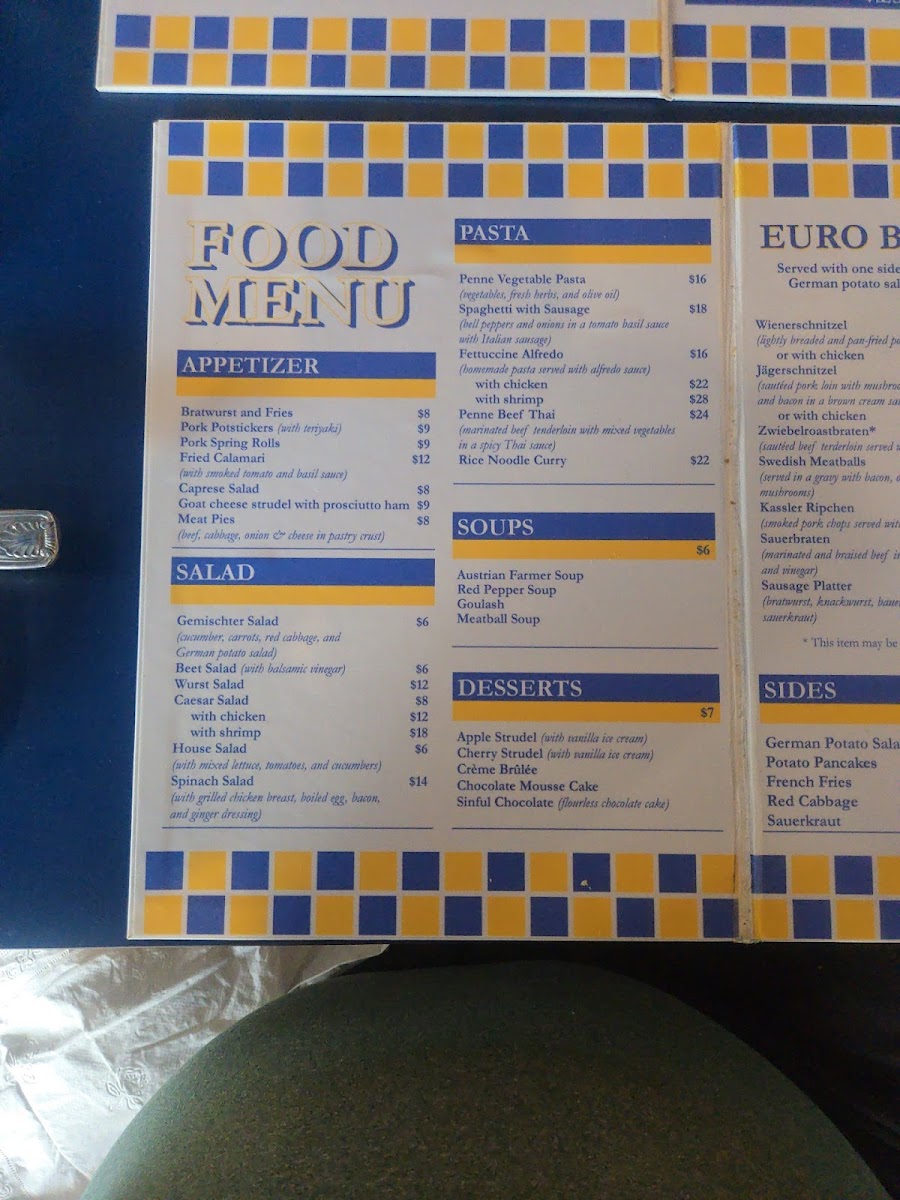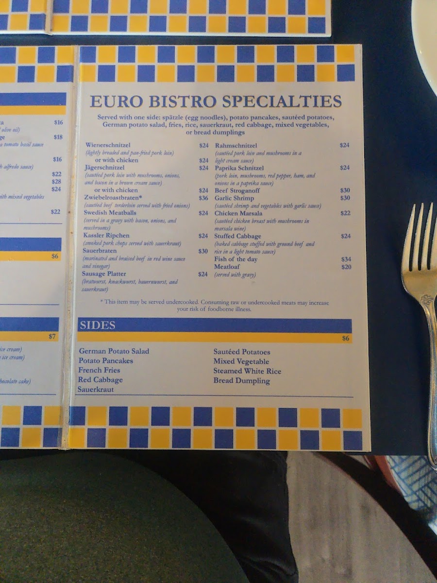 Euro Bistro offers a thoughtfully curated menu that reflects the comforting and hearty flavors of German and Austrian cuisine within a relaxed bistro setting. The menu features a variety of classic dishes, from lightly breaded Wienerschnitzel served alongside traditional German potato salad to creamy Rahmschnitzel with spaetzle. Patrons often find themselves enjoying these satisfying meals during cozy dinners or a casual night out, where familiar tastes meet a welcoming atmosphere.